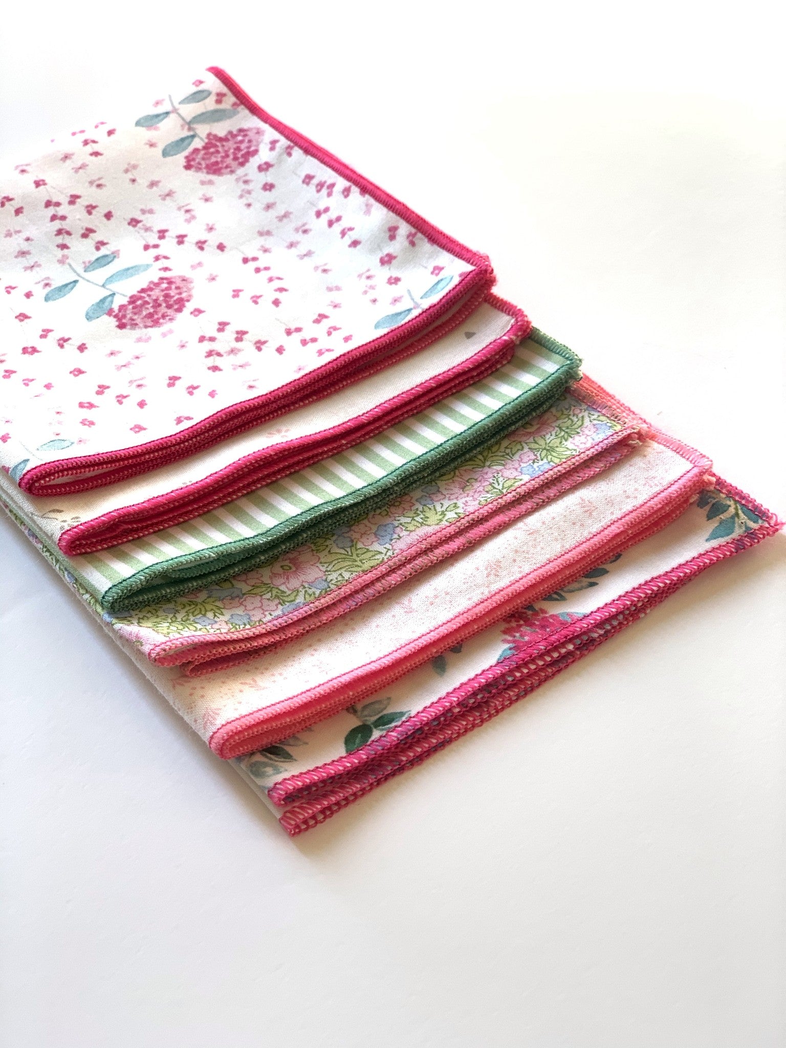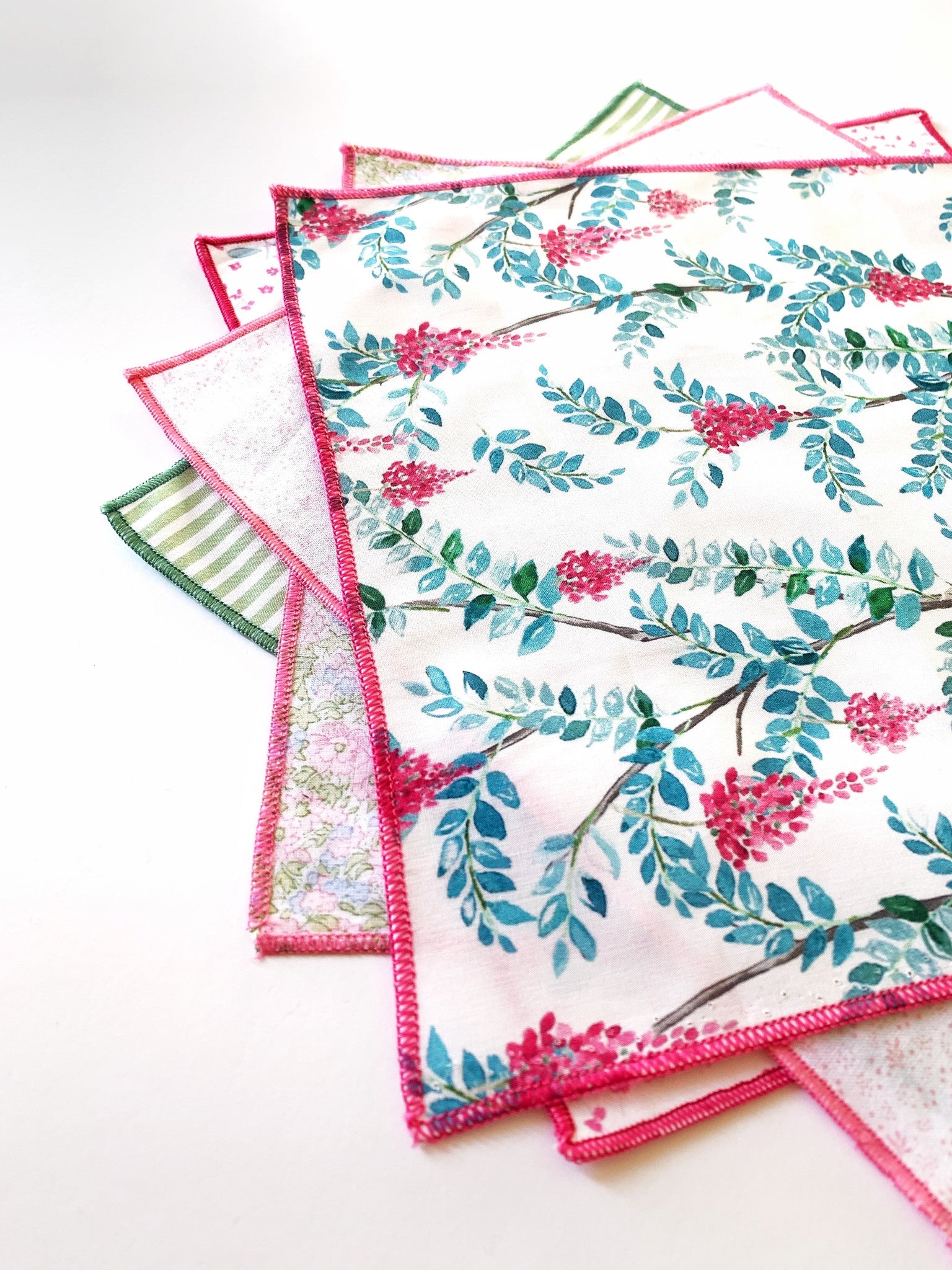 Aquests mocadors són una bona alternativa als d'un sol ús; elimines residus i reutilitzes excedents de teles. Elaborats amb teixits de fibres 100% naturals (cotó, lli, etc). Van en packs de 2 i mesuren aprox. 25 cm x 25 cm